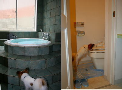 タルトはお部屋のお風呂やトイレを散策中~(^^ゞ ポリポリ